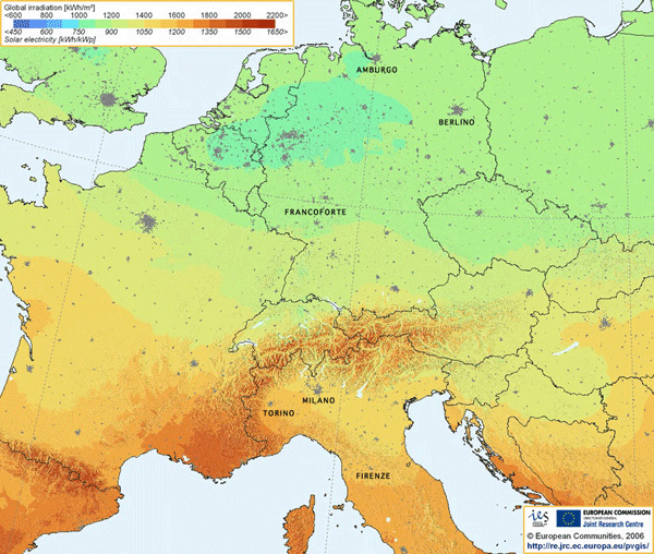Si osserva facilmente come, ad esempio in Piemonte, si avranno risultati paragonabili a quelli della Toscana settentrionale e che tali valori comportino rese energetiche del 15-35% maggiori rispetto al territorio tedesco, dove la potenza fotovoltaica installata è 40 volte circa quella italiana...